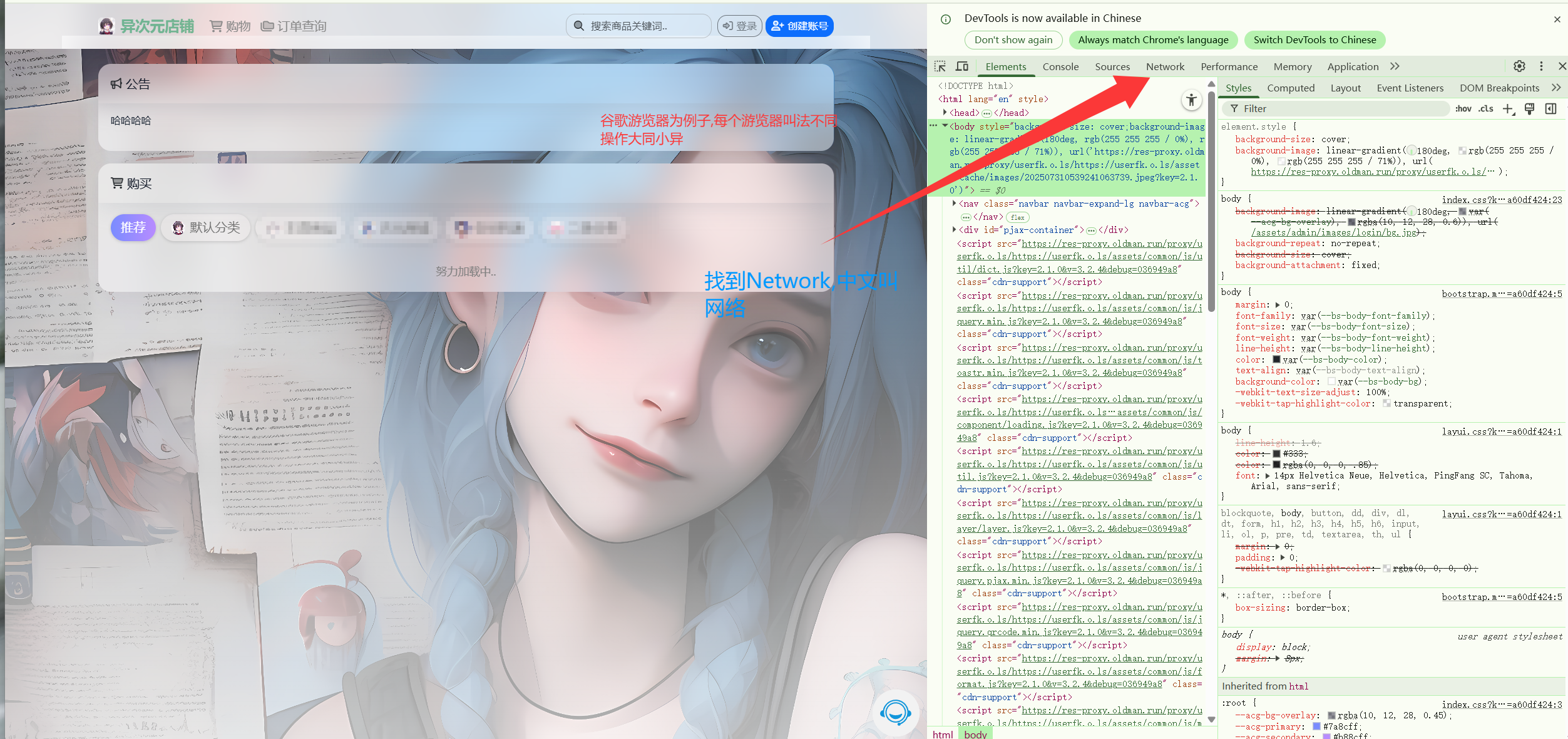 3.第三步,找到您的报错区域,错误系统分两种,分别为页面404报错,以及小黑条