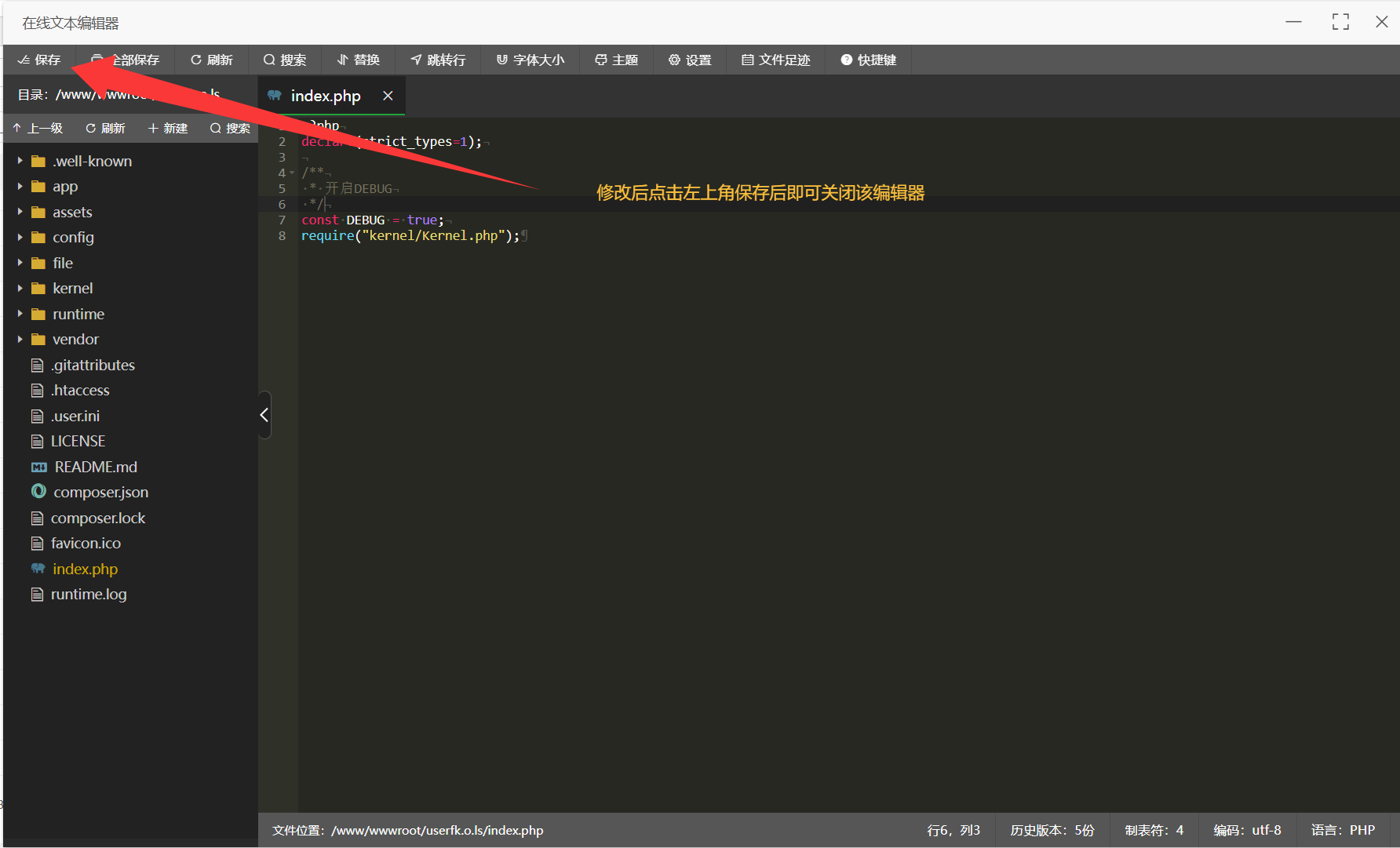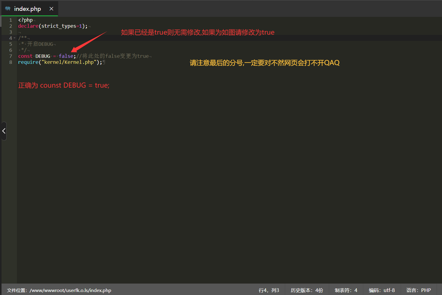 2.第二步,双击打开index.php,后找到 “const DEBUG = false;”该字段,将[false]变更为[true]