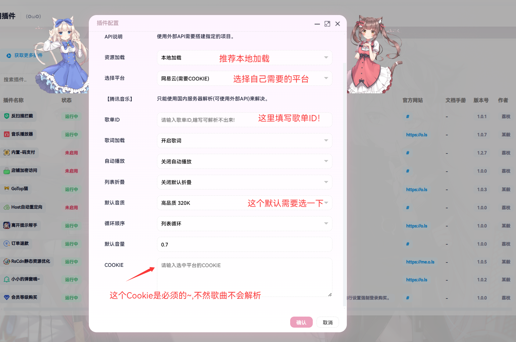 您好,我的音乐插件,cookie我已放入,之前是可以正常跑起来的,但是今天突然无法解析,甚至不显示其播放器了